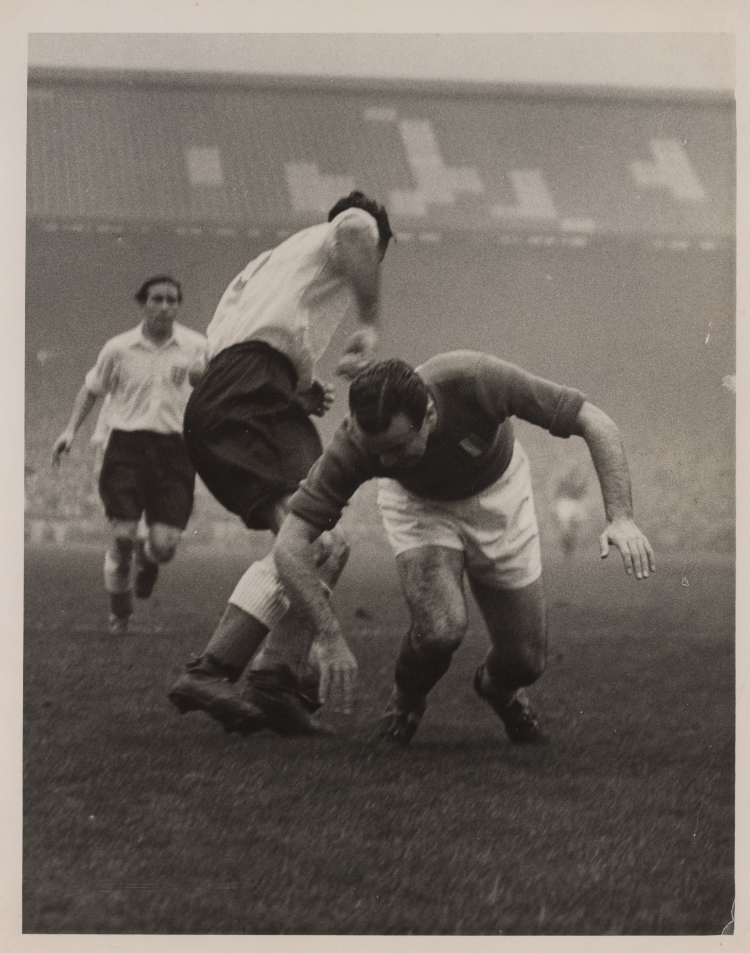Original Press football photograph of John Aston (Snr), the Manchester United and England left back, getting the better of the Italian centre forward Amadeo Amadei during the game played at White Hart Lane on November 30th 1949.