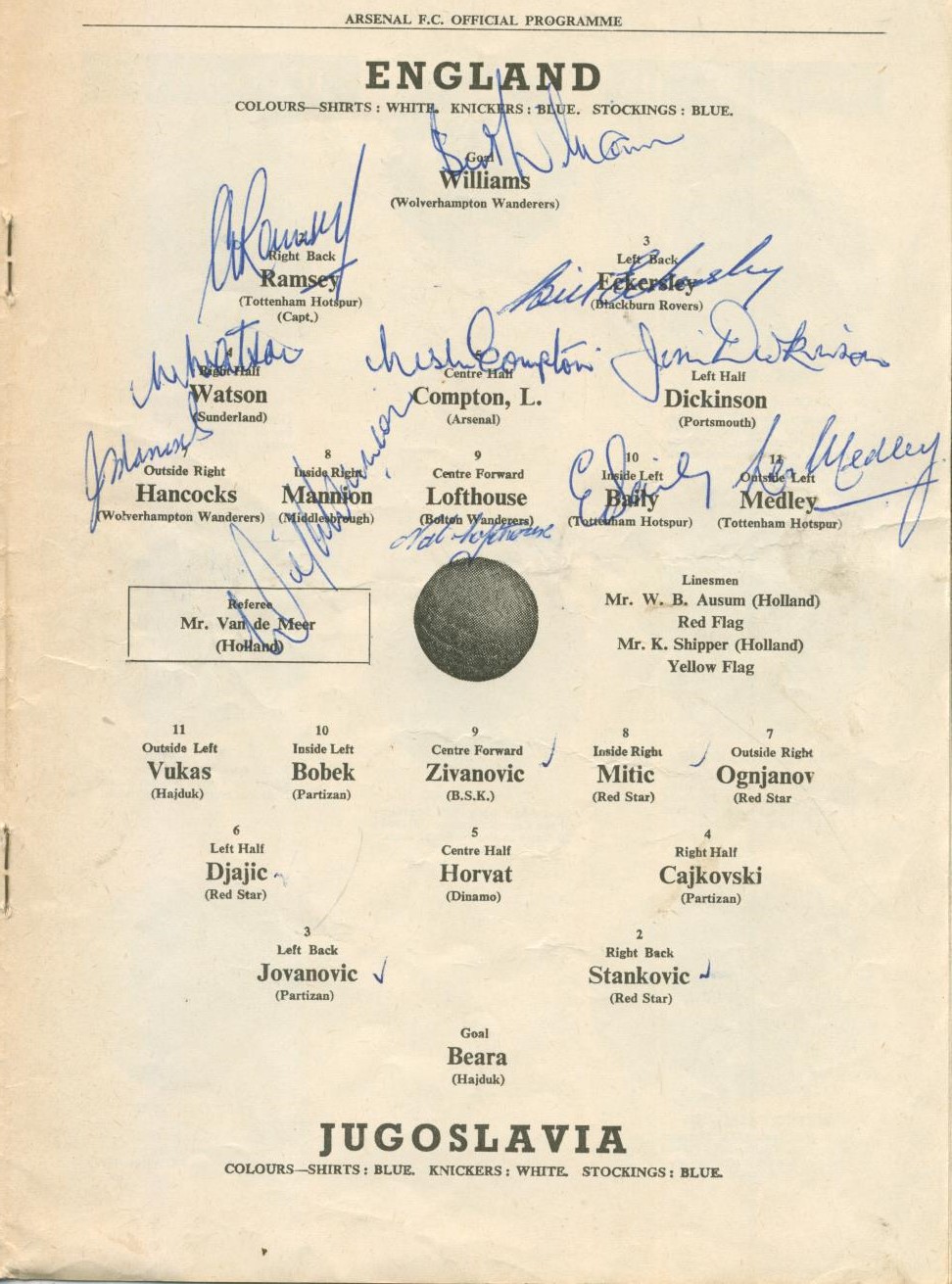 Official match programme for the game played at Highbury on November 22nd 1950. Signed to the team sheet by the full England team - Williams, Ramsay, Eckersley, Watson, L. Compton, Dickinson, Hancocks, Mannion, Lofthouse, Baily and Medley.