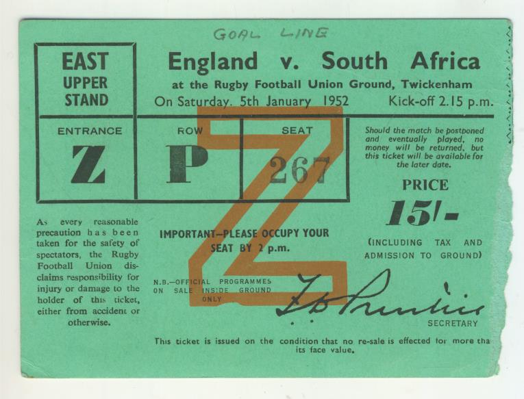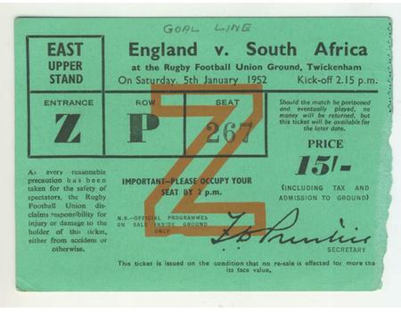 ENGLAND V SOUTH AFRICA 1952 RUGBY TICKET