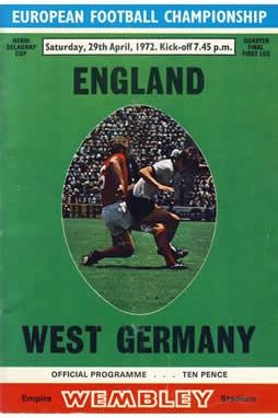 Official programme for the European Championships quarter-final (1st leg) between England and West Germany played at Wembley, April 29th 1972. West Germany won 3-1, winning on aggregate by the same score.