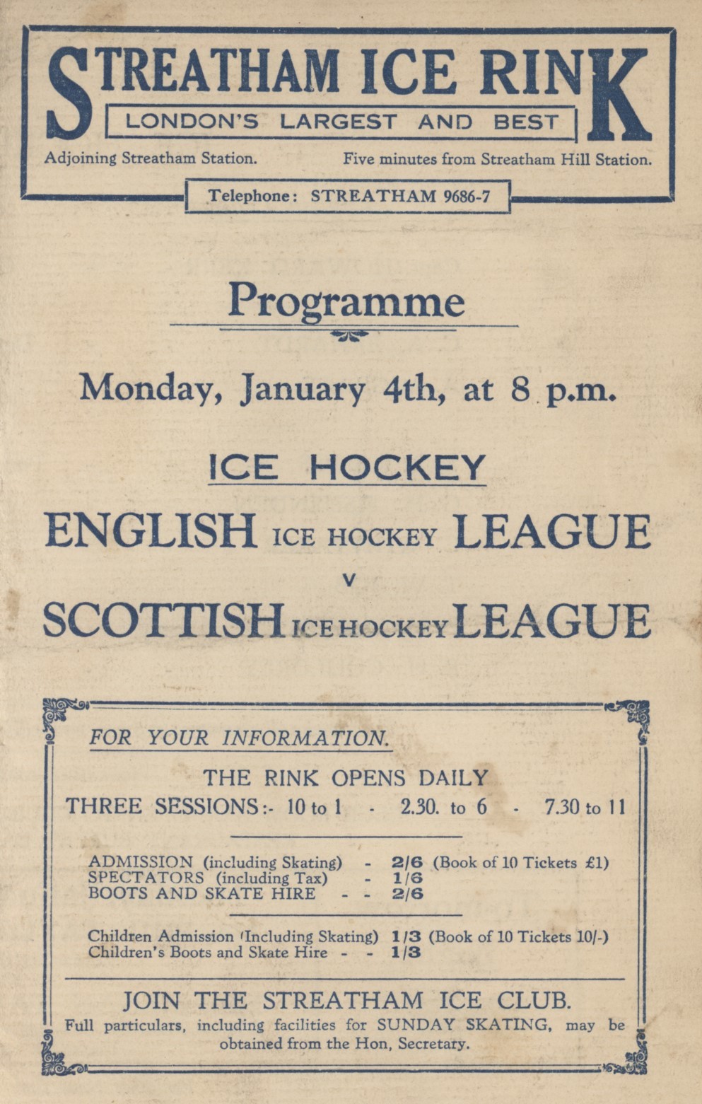 Official programme for the ice hockey match at Streatham Ice Rink on Monday January 4th, 1932.
