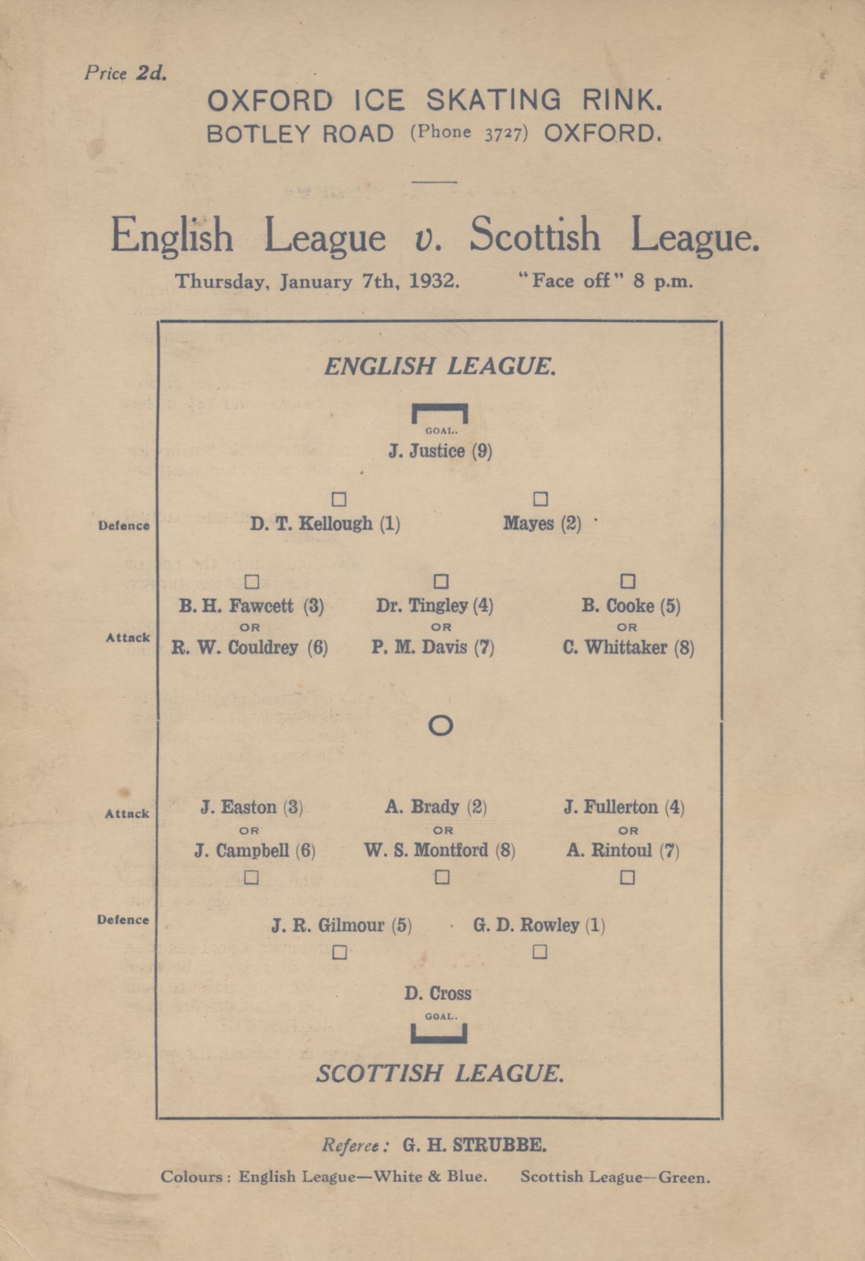 Official programme for the ice hockey match at Oxford Ice Skating Rink on Thursday January 7th, 1932.