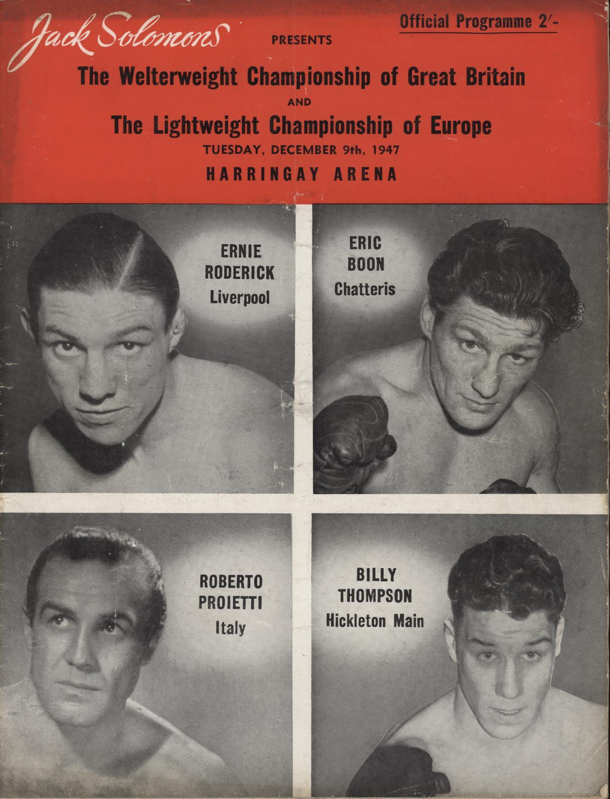 Official boxing programme for the Welterweight Championship of Great Britain contest held at Harringay Arena on December 9th 1947. Proietti v Thompson also on card.