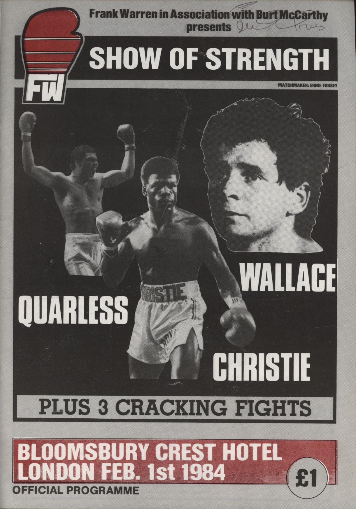 Official programme for the fight at Bloomsbury Crest Hotel, London, 1st February 1984. The card also included Noel Quarless v Oscar Holman and Keith Wallace v Esteban Eguia.