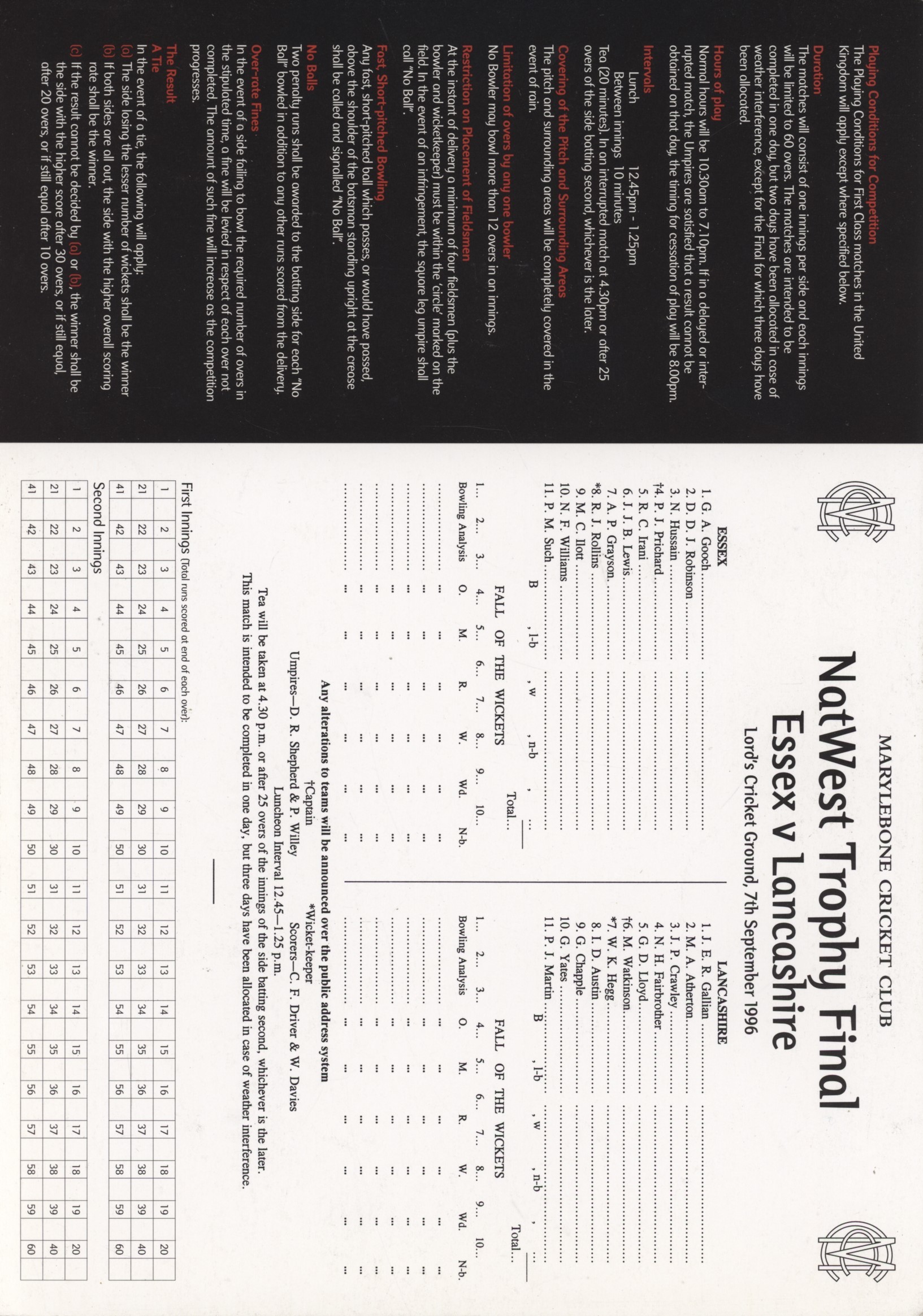 ESSEX V LANCASHIRE 1996 NATWEST FINAL CRICKET SCORECARD