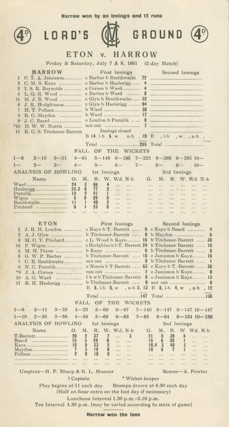 Lord's, July 7-8, 1961. Harrow won by an innings and 12 runs after Titchener-Barrett had his moment in the sun, taking 12 wickets in the match.