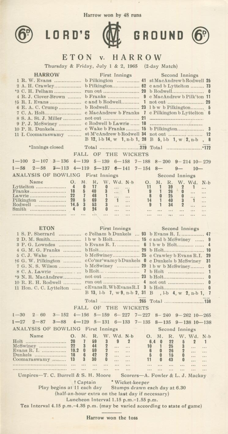 Cricket » Cricket Scorecards » Schools/Universities » ETON V HARROW 1965 CRICKET SCORECARD