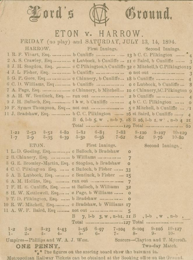 Cricket » Cricket Scorecards » Schools/Universities » ETON V HARROW 1894 CRICKET SCORECARD