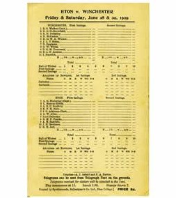 ETON V WINCHESTER 1929 CRICKET SCORECARD