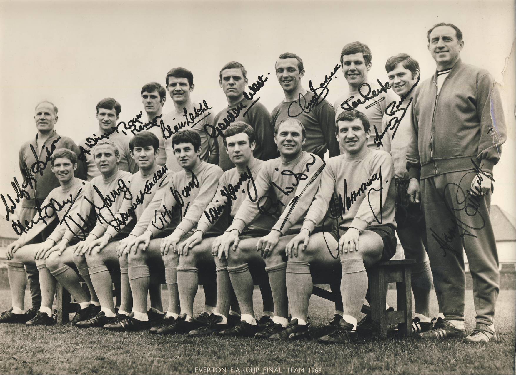 Original black and white photograph of the Everton team that played in the 1968 FA Cup final, losing 1-0 to West Bromwich Albion. Signed in black ink by all the players across their images, including Roger Kenyon, Brian Labone, Alan Ball, Gordon West, Ray Wilson, Colin Harvey, Alex Young, Howard Kendall and Joe Royle.