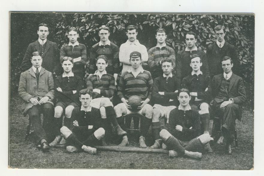 Exeter University football team from 1909-10 - the captain's cap confirms this. The photograph was taken in Hostel Gardens.