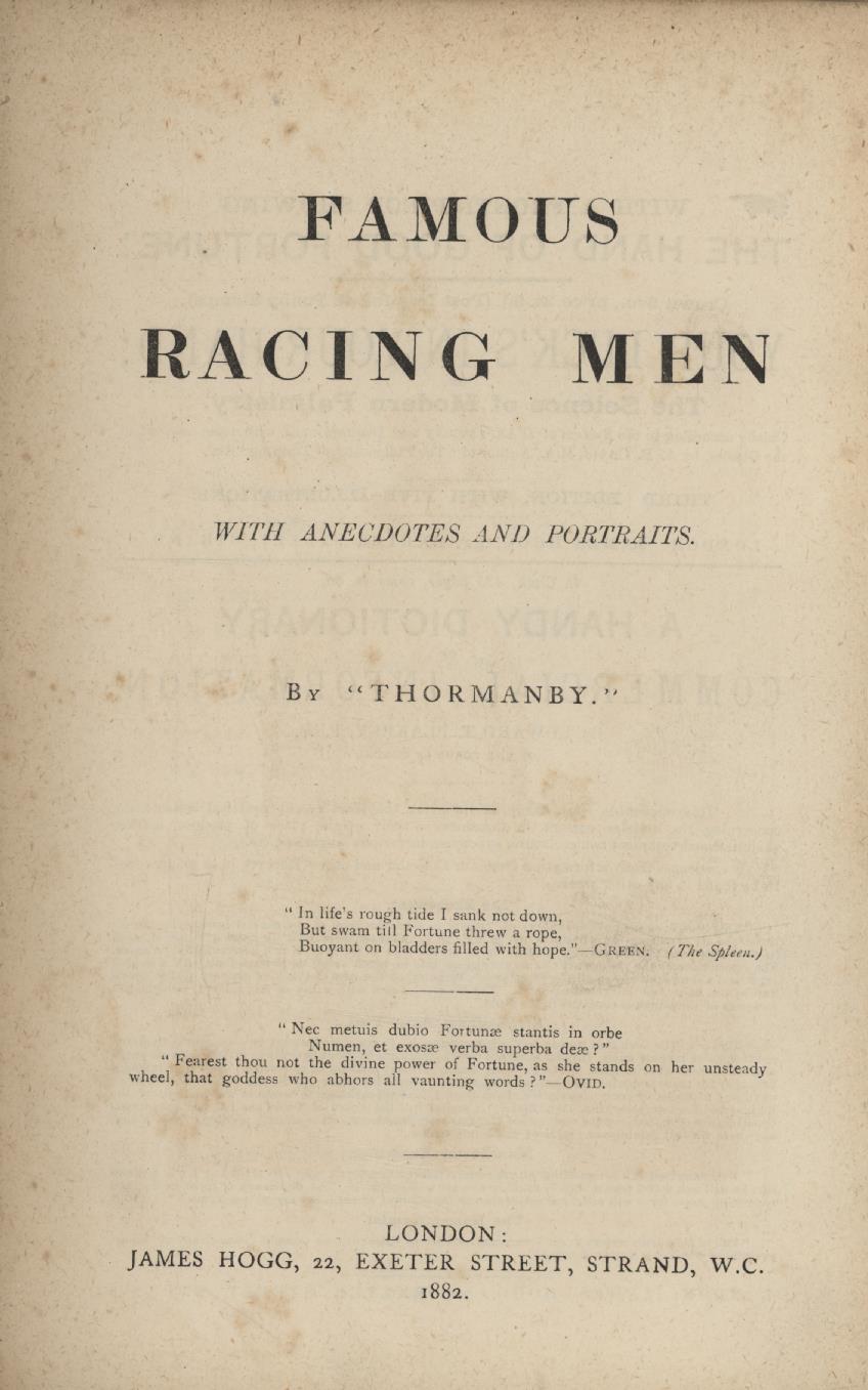 A nice contemporary account of many of the greatest racehorse owners of the 19th century, with fine original illustrations.