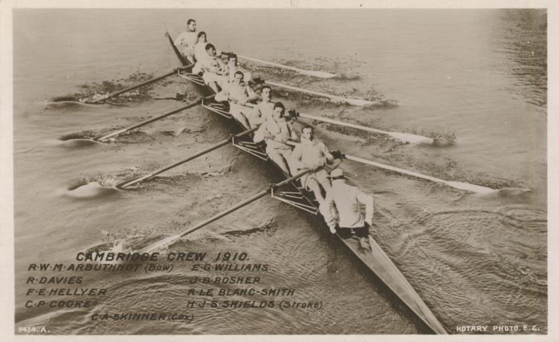 Postcard showing the Cambridge crew of 1910 in the boat with all members' names printed to front on the image.