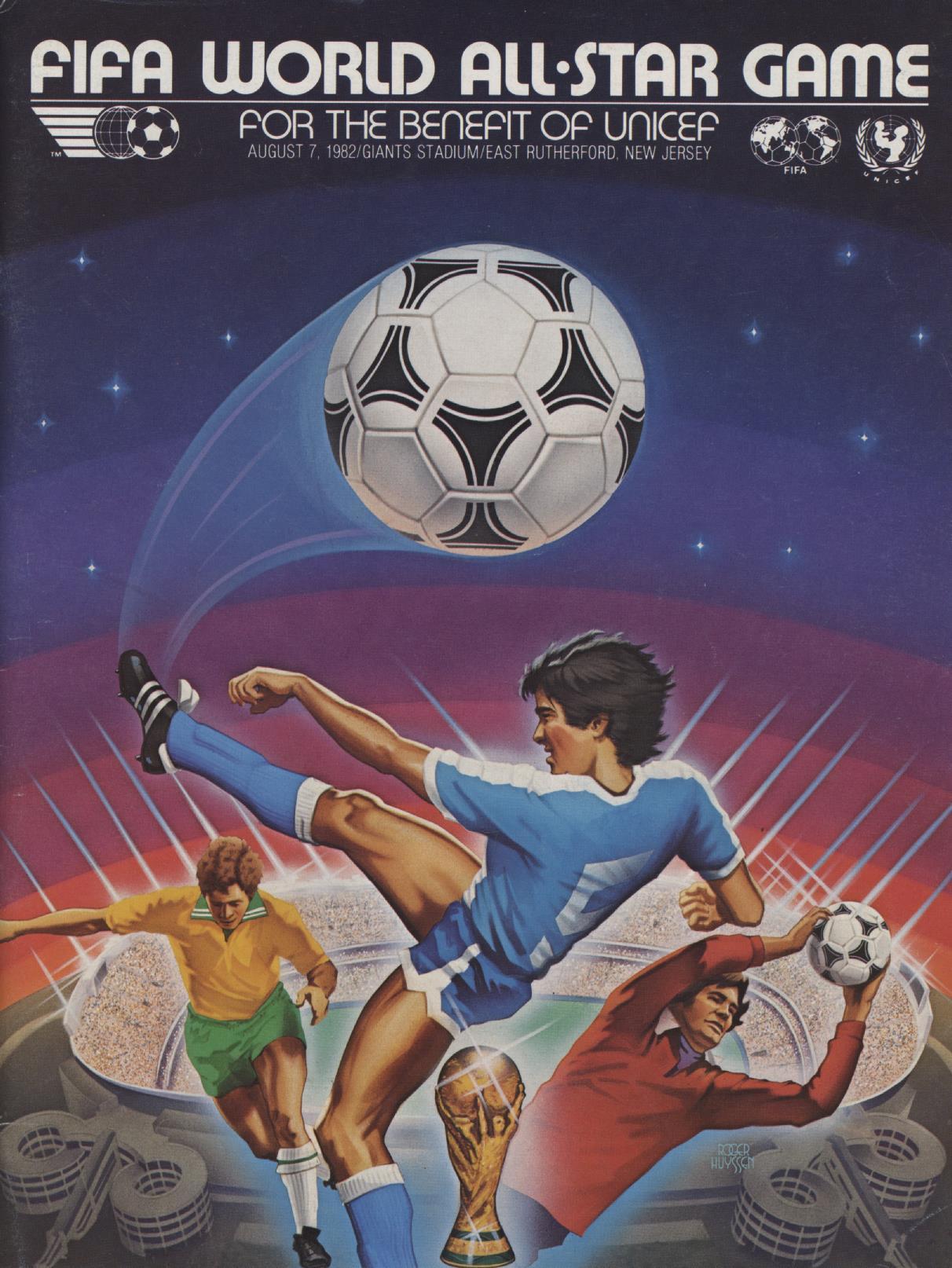 Official programme for the match between Europe and Rest of the World played at Giants Stadium, New Jersey on 7 August 1982, featuring players including Maradona, Zico, Ardiles, Beckenbauer, Platini and Keegan. Pele was the honorary captain of the World XI.