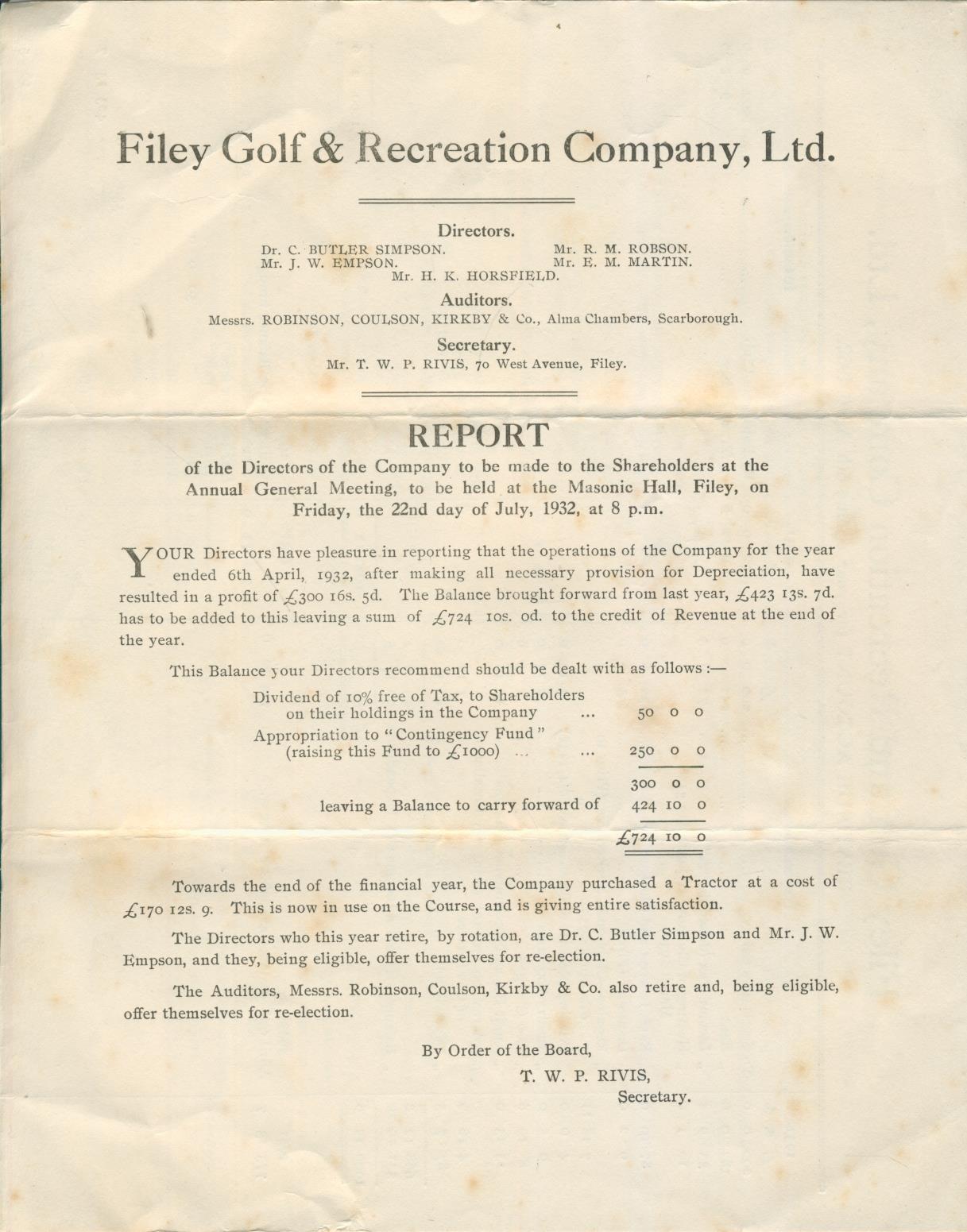 Report, Revenue Account and Balance Sheet for year ending April 6th, 1932, for Filey Golf Club in North Yorkshire.