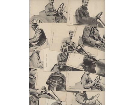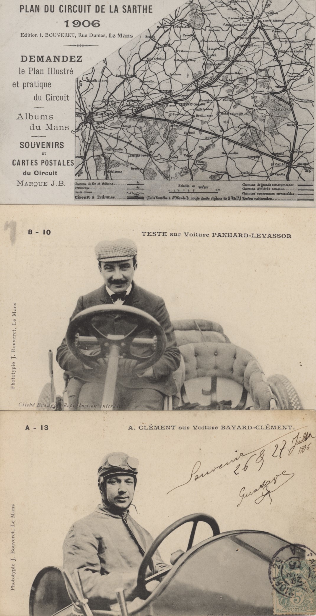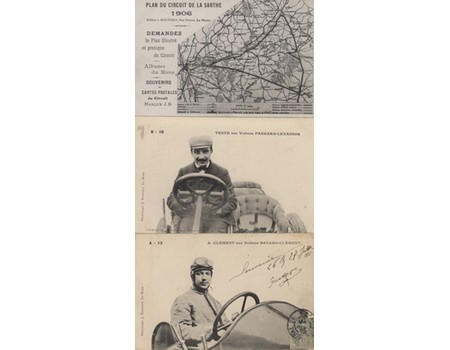 19 original postcards. Each published by J. Bouveret of Le Mans from photographs by Maurice-Louis Branger. Includes a map of the circuit and 18 individual drivers (and cars), including the winner Ferenc Szisz and Albert Clement. The 1906 race was the first French Grand Prix and was hosted by the Automobile Club de France (ACF). It was created at the initiative of the French automotive industry as an alternative to the Gordon Bennett Cup.