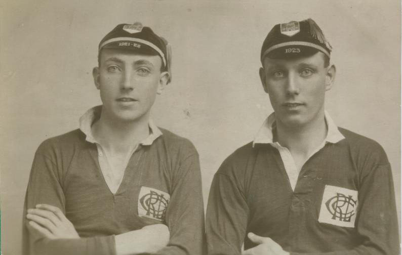 Postcard of the Fisher Brothers in Cumberland Rugby League jerseys and caps (dated 1923).