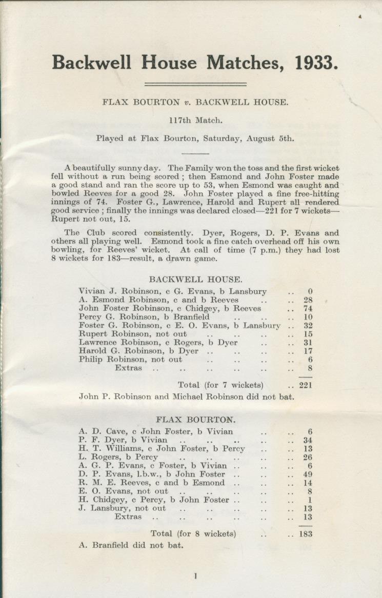 Flax Bourton, Aug 5, 1933. Drawn. Backwell House consisted of 11 members of the Robinson family. This was the 117th match in the series.