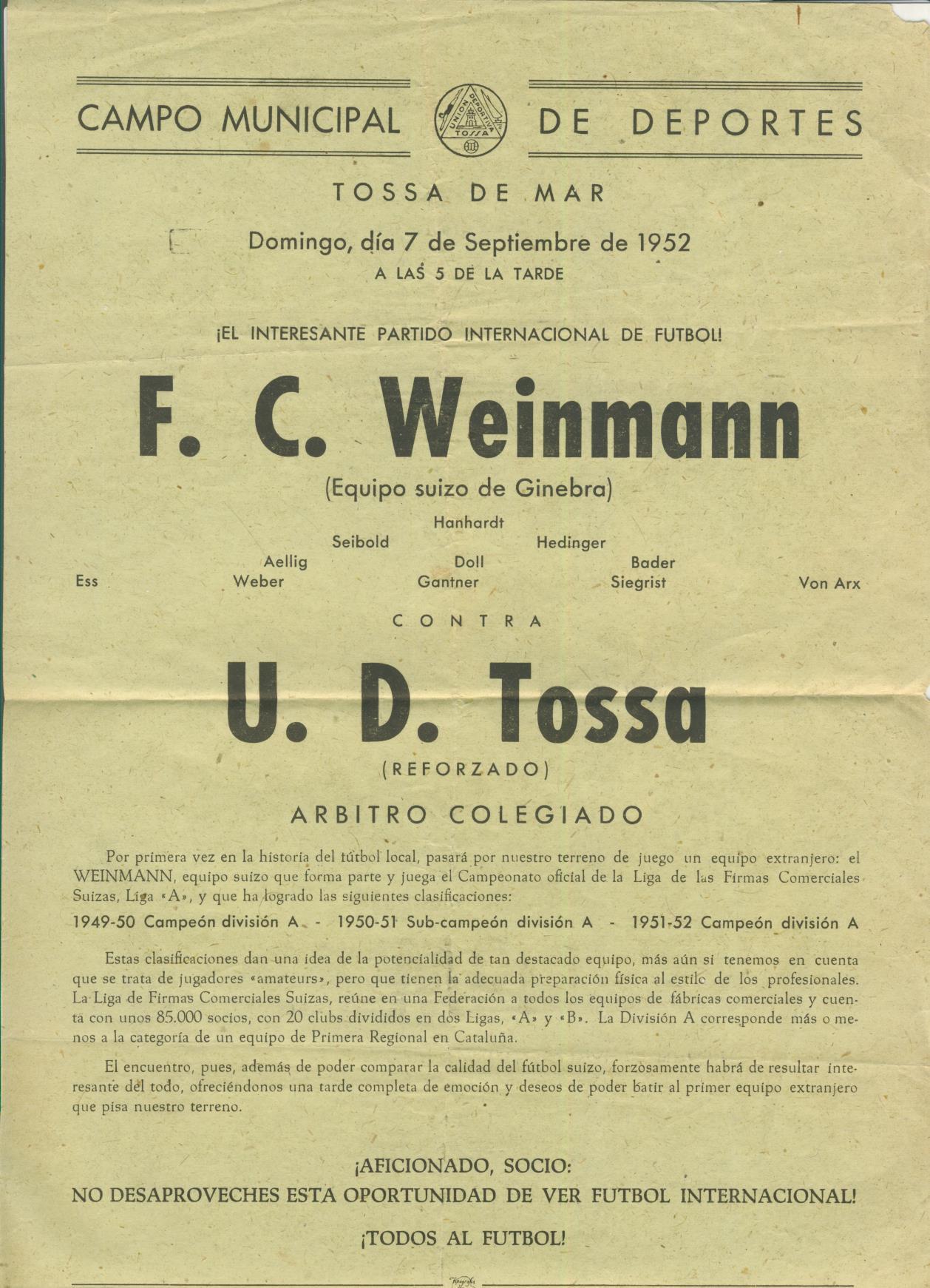Broadsheet flyer advertising the visit of Swiss side F.C. Weinmann (of Geneva) to Spanish team U.D. Tossa (Tossa de Mar). Shows the Weinmann line-up.
