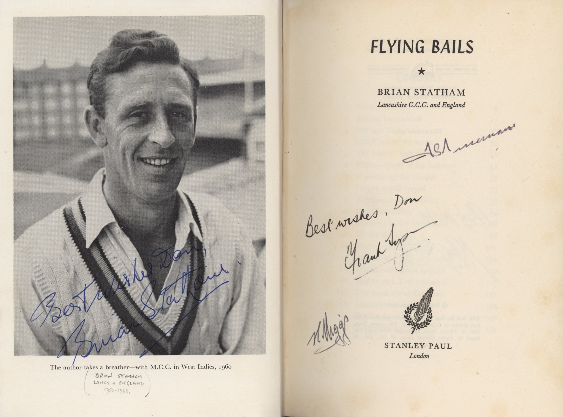 8vo. 160pp. Portrait frontis., 15 pages of photographs. Dust-wrapper, lightly rubbed. Very good condition. Signed very nicely by Statham in blue ink to his frontispice photograph and also signed to title-page by Statham's fellow England bowlers Fred Trueman, Frank Tyson and Ken Higgs. Additionally signed by Malcolm Marshall to next page. Statham and Tyson have dedicated their autographs to Don (Crossley), co-founder of the CMS (from whose collection this comes).