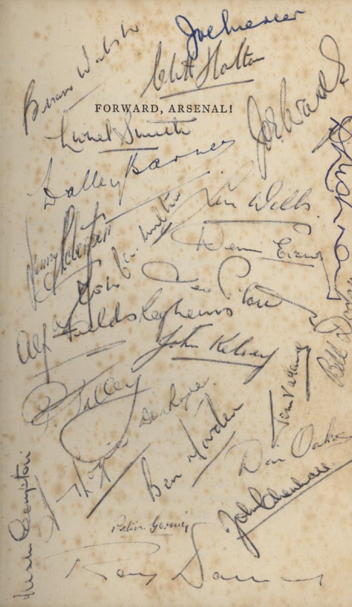 8vo. xvi + 212pp. 32 pages of photographs. Foxing to endpapers (including signed page). Fly-leaf has been very neatly replaced. Dust-wrapper, lightly rubbed to edges. Good condition. Signed to half title-page by 26 Arsenal players, virtually all from the 1952-53 Championship winning season - Mercer, Barnes, Lionel Smith, Dodgin, Milton, Leslie Compton, Holton, Evans, Wills, Lewis, Marden, Oakes, Tilley, Roper, Lishman, Logie, Kelsey, Chenhall, Goring, Wade, Daniel, Robertson, Fields, Platt and a couple unidentified.