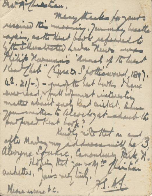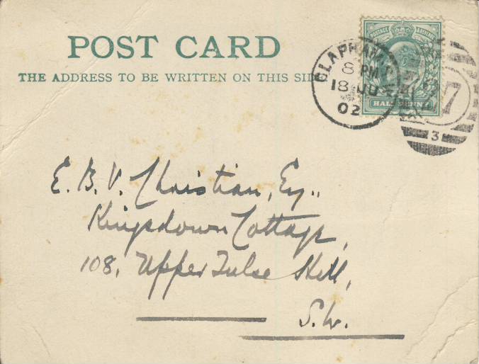 Postcard, sent by Ashley-Cooper to EBV Christian in 1902. In it he discusses Philip Norman's "Annals of West Kent Cricket" - "one of the best books I have ever read"; and noting a forthcoming change of address.