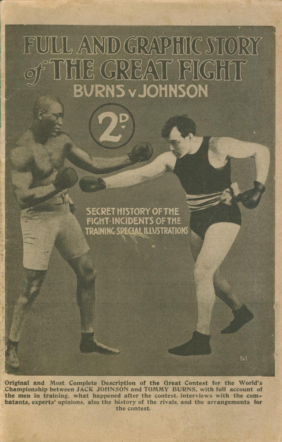 Boxing booklet covering the famous fight between Tommy Burns and Jack Johnson in 1908. Includes full details of the fight, interviews with the combatants, expert opinions etc.