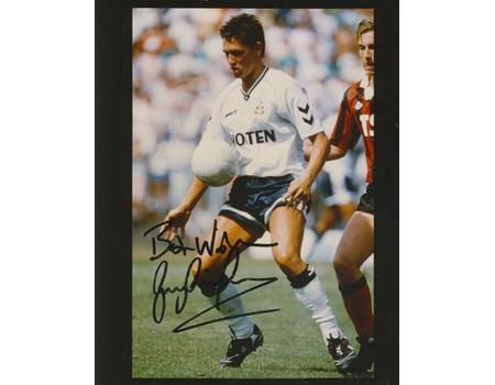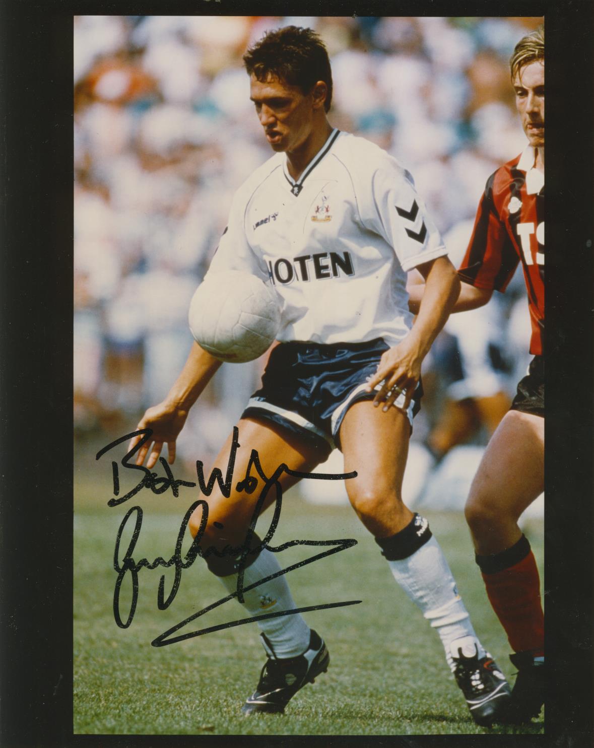 Full colour photo of Gary Lineker in action for Spurs. Signed 'Best Wishes Gary Lineker". Some minor ink surface loss to autograph - but still very good.