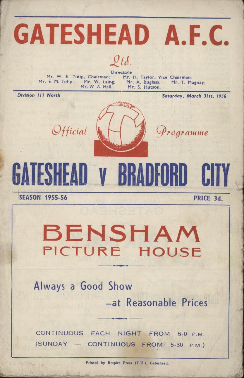 Football » Football Programmes » Clubs G-K Home Matches » GATESHEAD V BRADFORD CITY 1955-56 FOOTBALL PROGRAMME