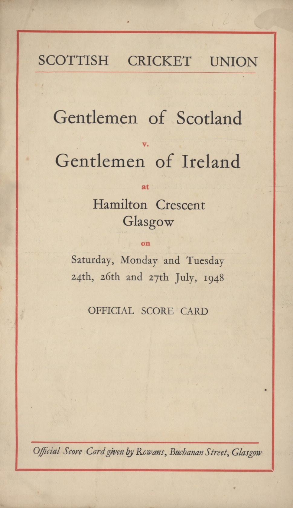 GENTLEMEN OF SCOTLAND V GENTLEMEN OF IRELAND 1948 CRICKET SCORECARD