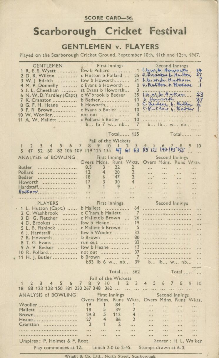GENTLEMEN V PLAYERS 1947 CRICKET SCORECARD - SCARBOROUGH FESTIVAL