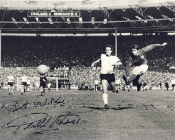 Black and white photograph of Geoff Hurst shooting for goal (England's 4th). Printed later. Signed in ink "Best Wishes Geoff Hurst".