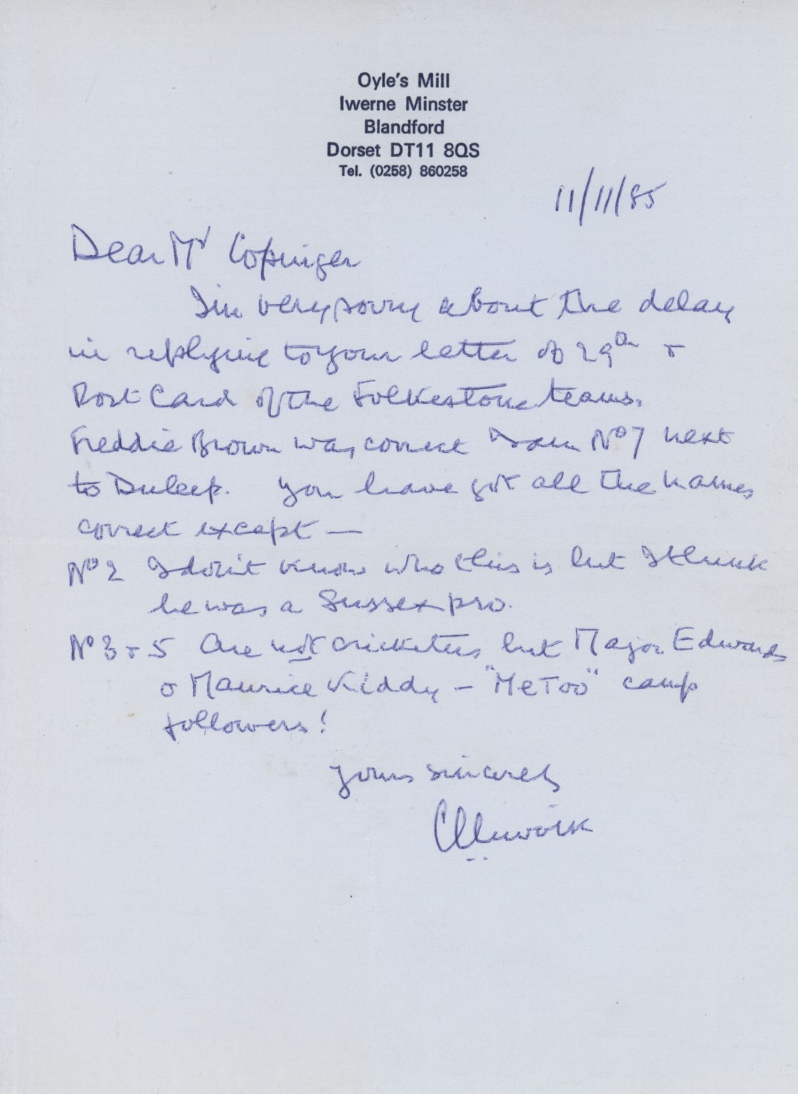 Handwritten letter from G.E. Livock (Middlesex 1925-27) to the cricket collector Geoffrey Copinger. Livock is confirming in the letter the identities of some players featured in a postcard from Copinger's collection. Group Captain Livock is perhaps best known as a pioneering RAF officer who served through both Wars.