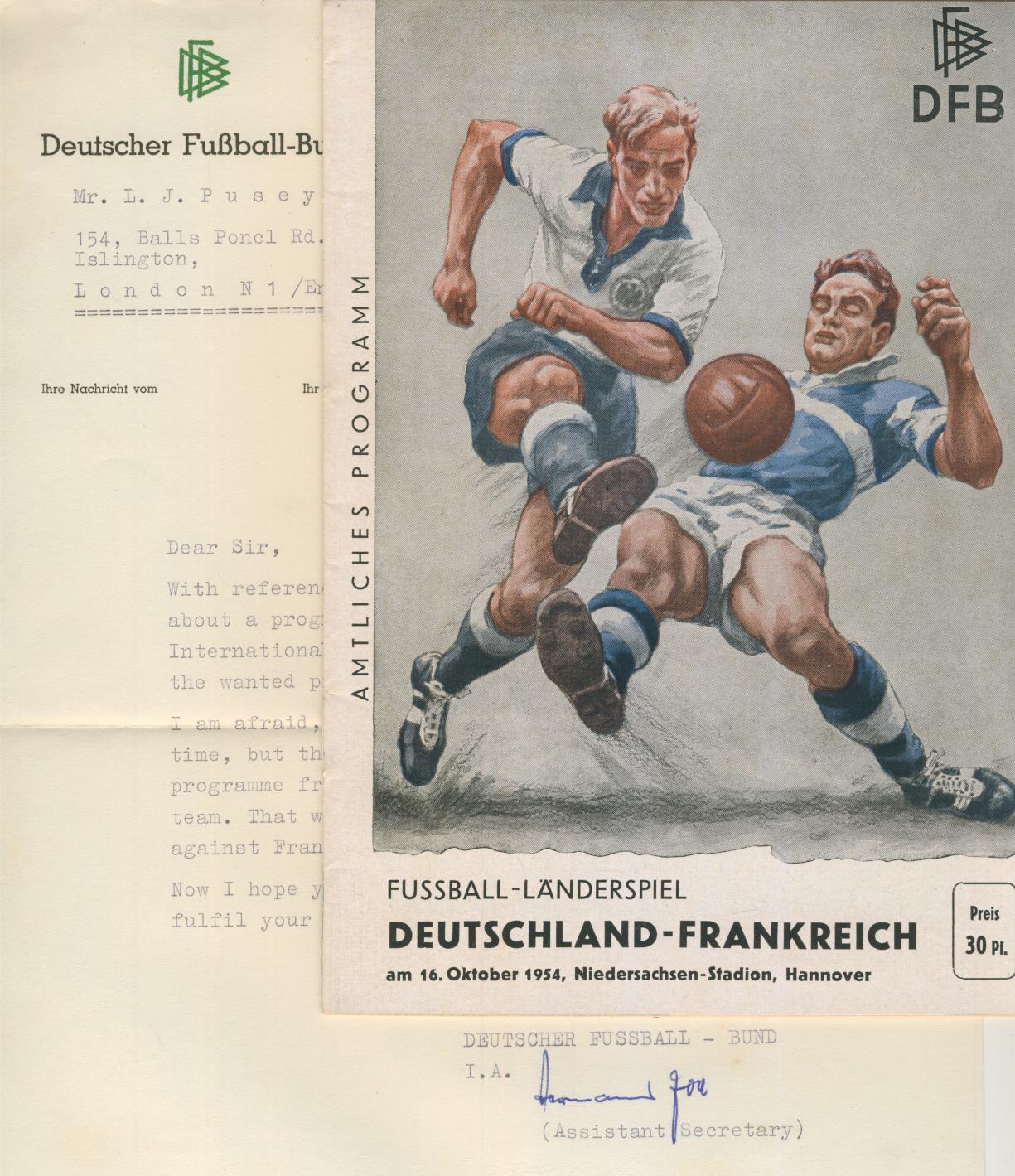 Staple removed and replaced very neatly with thread. A letter from the Assistant Secretary of the German Football Association is enclosed. Fine condition.
