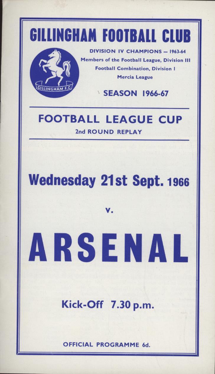 GILLINGHAM V ARSENAL 1966-67 (LEAGUE CUP 2ND ROUND REPLAY) FOOTBALL PROGRAMME