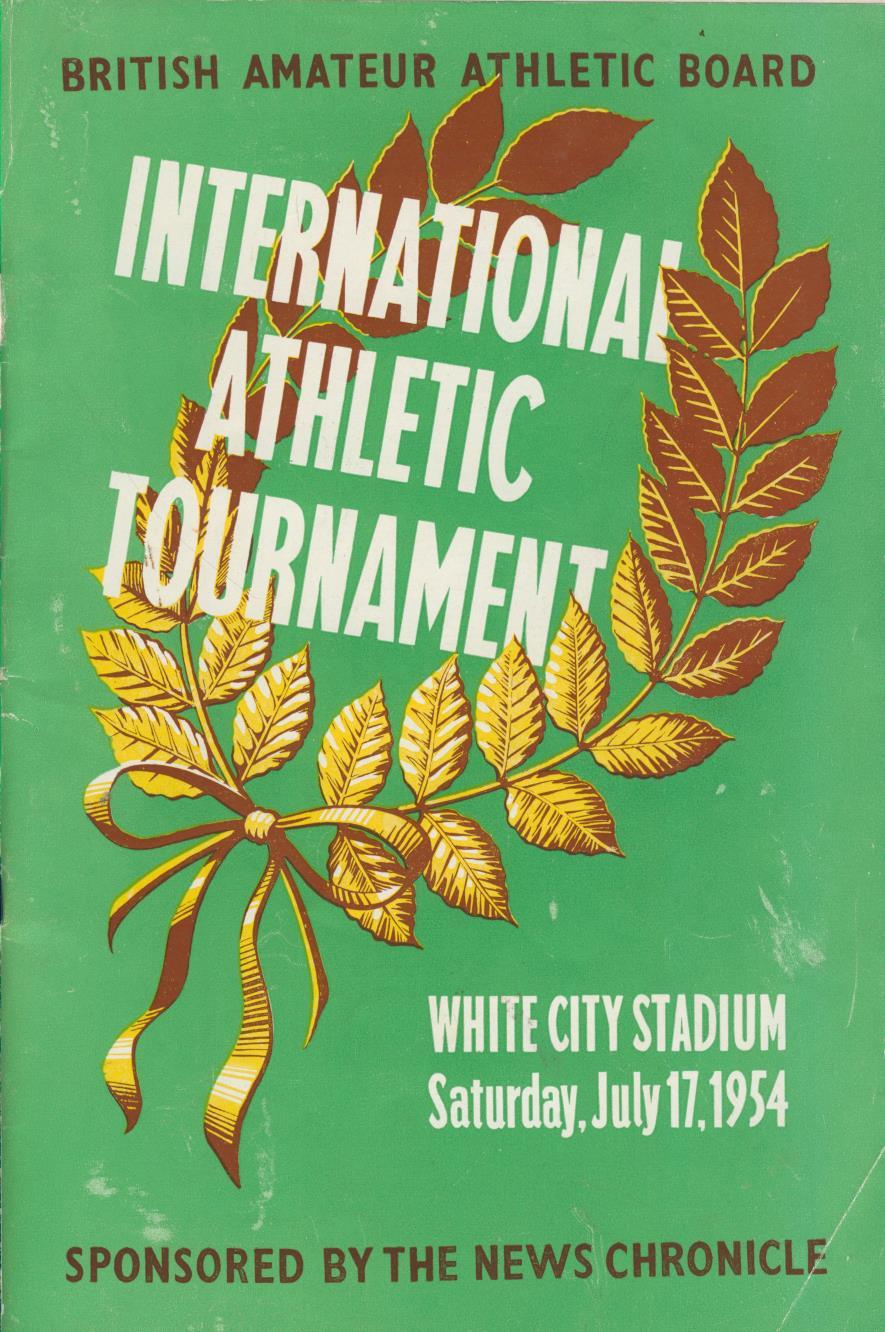Official programme for the Athletics match that took place at White City on July 17th 1954. It featured Roger Bannister running in the 1500m relay just two months after running a four-minute mile.