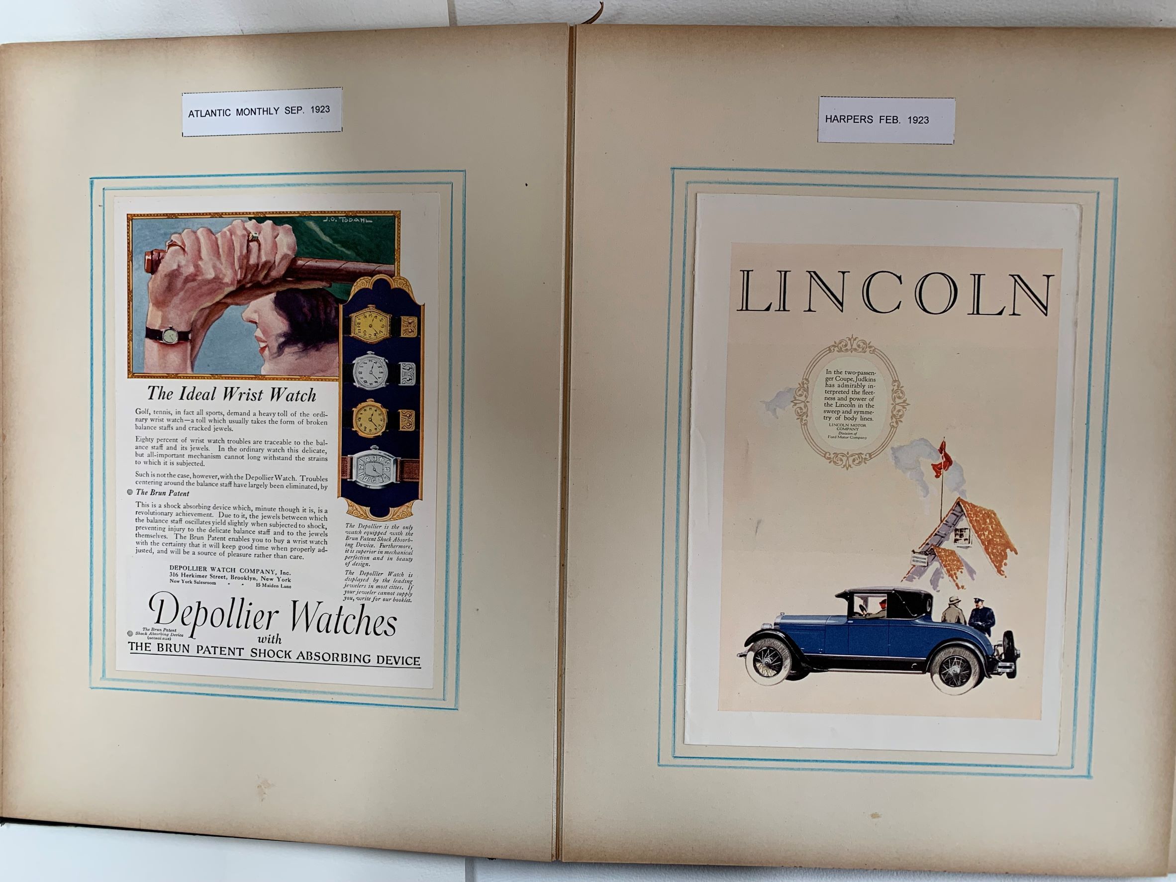 Neatly assembled album of cut-outs with each mounted to a cardboard page and surrounded by a hand-drawn border. Over 100 adverts taken from magazines such as Atlantic Monthly, Harpers, International Studio and Tatler, many humorous and very much of the period.