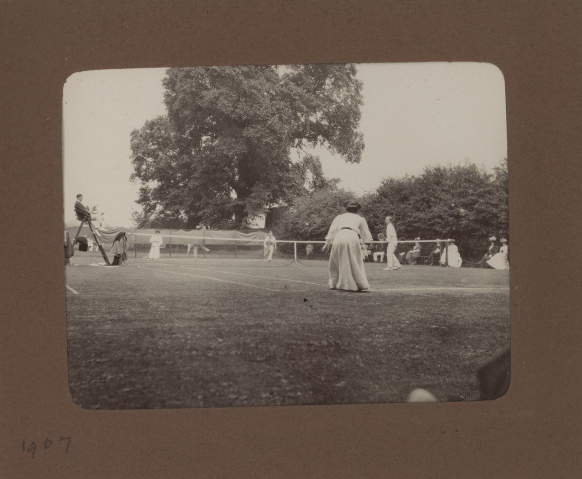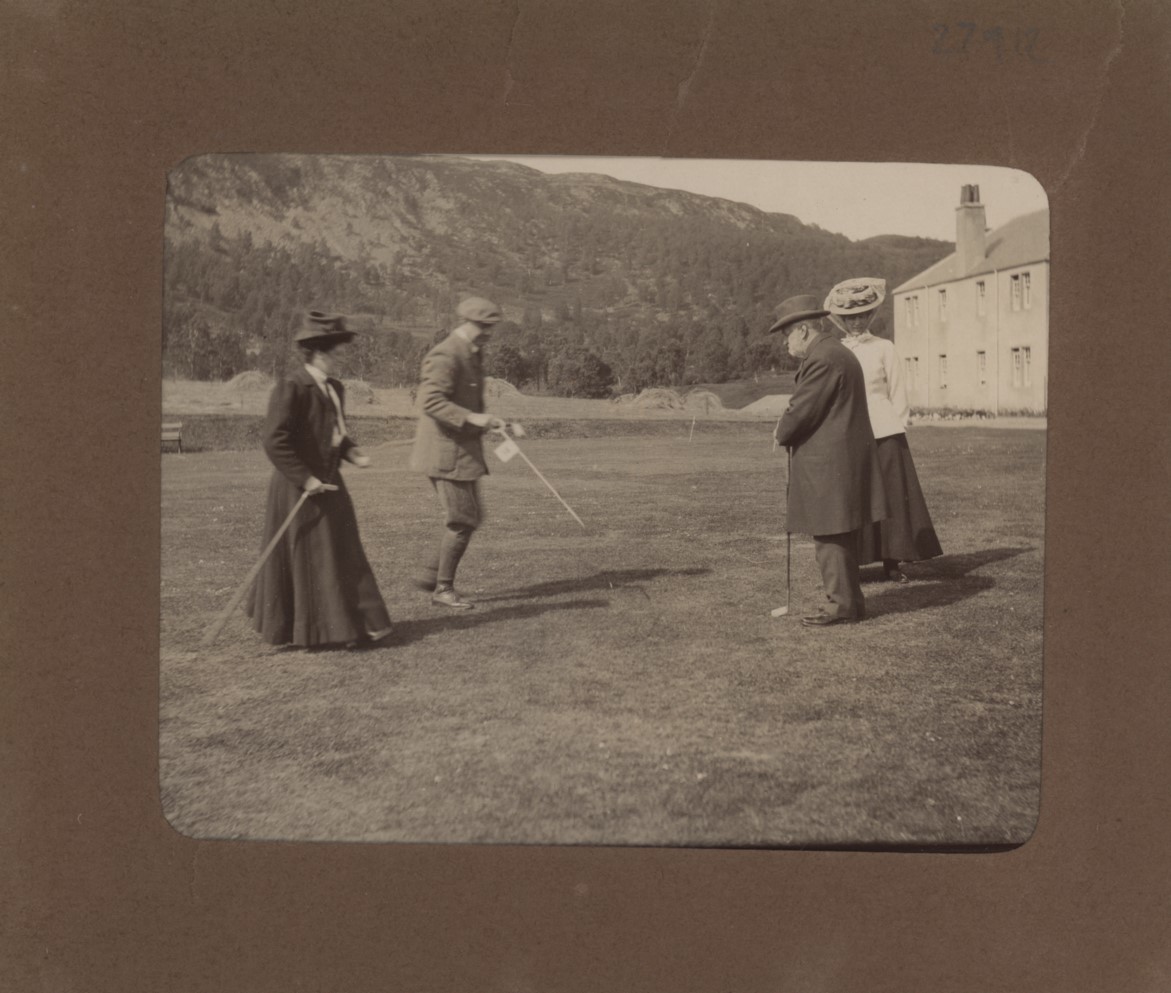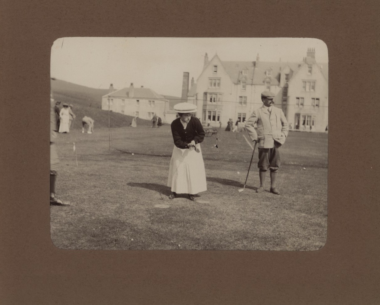 Candid photo album of ladies and gentlemen playing golf, tennis and punting in Aviemore and Bedford in 1907 and 1908. There are around 14 photographs of golf scenes at a country property near Aviemore as well as 3 tennis scenes from the same location (and a few general photos). At the end of the album are 3 punting scenes from the Bedford area, taken the following year (1908).