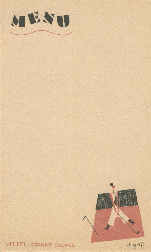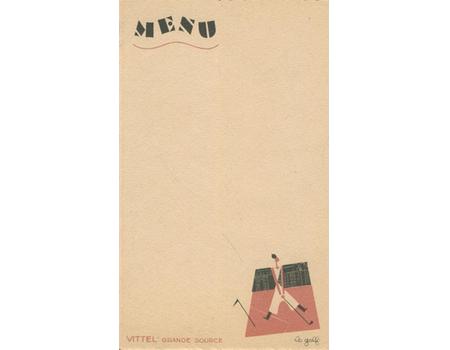 Blank menu card advertising Vittel Grande Source and featuring a stylised image of a French golfer, with the title "Le Golf".