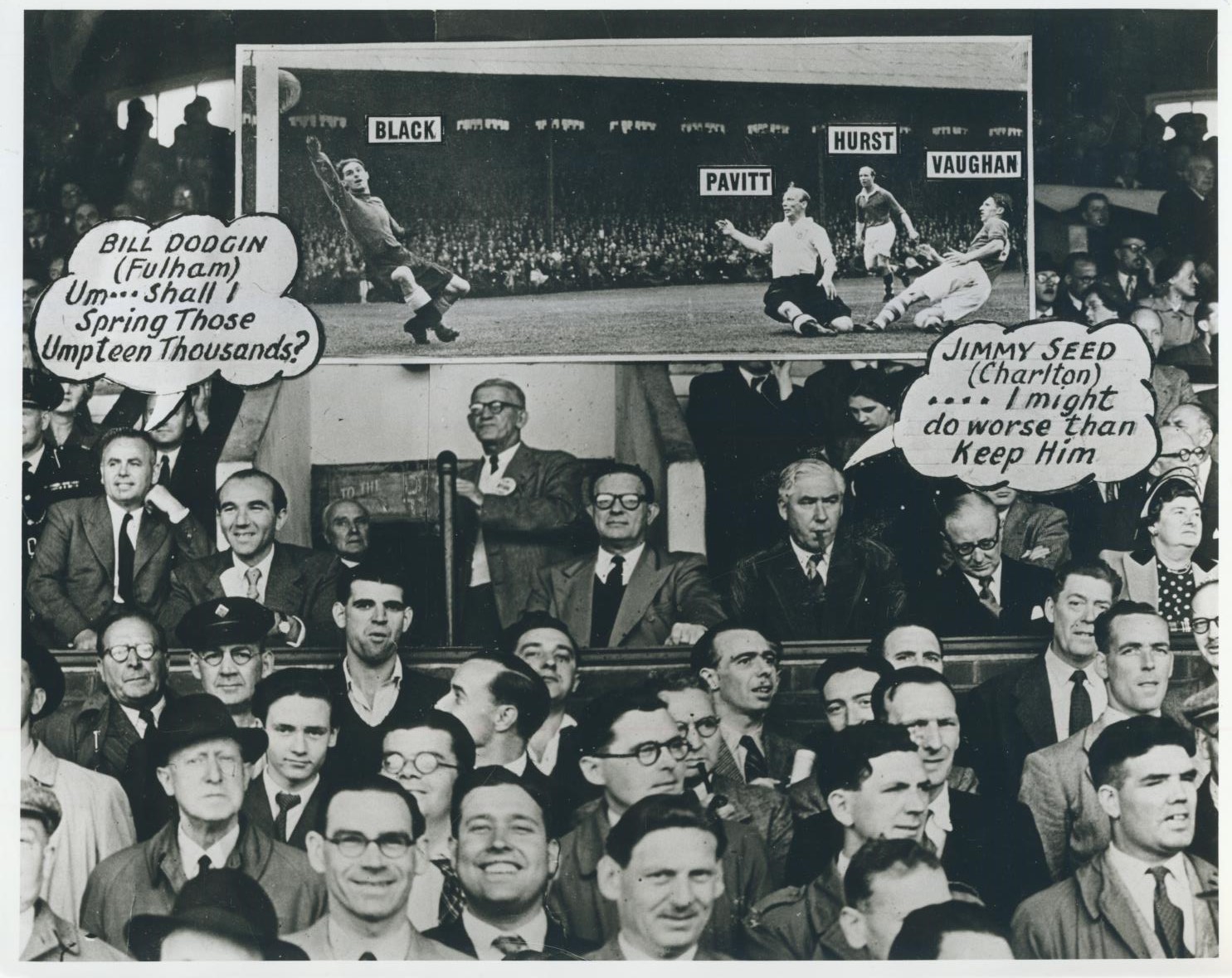 Black and white composite photograph showing the crowd, including the two managers, at a match between Fulham and Charlton Athletic in the early 1950s. The smaller photograph shows Charlie Vaughan scoring past Ian Black with Pavitt and Hurst looking on. The two managers are given speech bubbles - Dodgin: "Um ...shall I Spring those Umpteen Thousands?" and Jimmy Seed: "...I might do worse than Keep him".