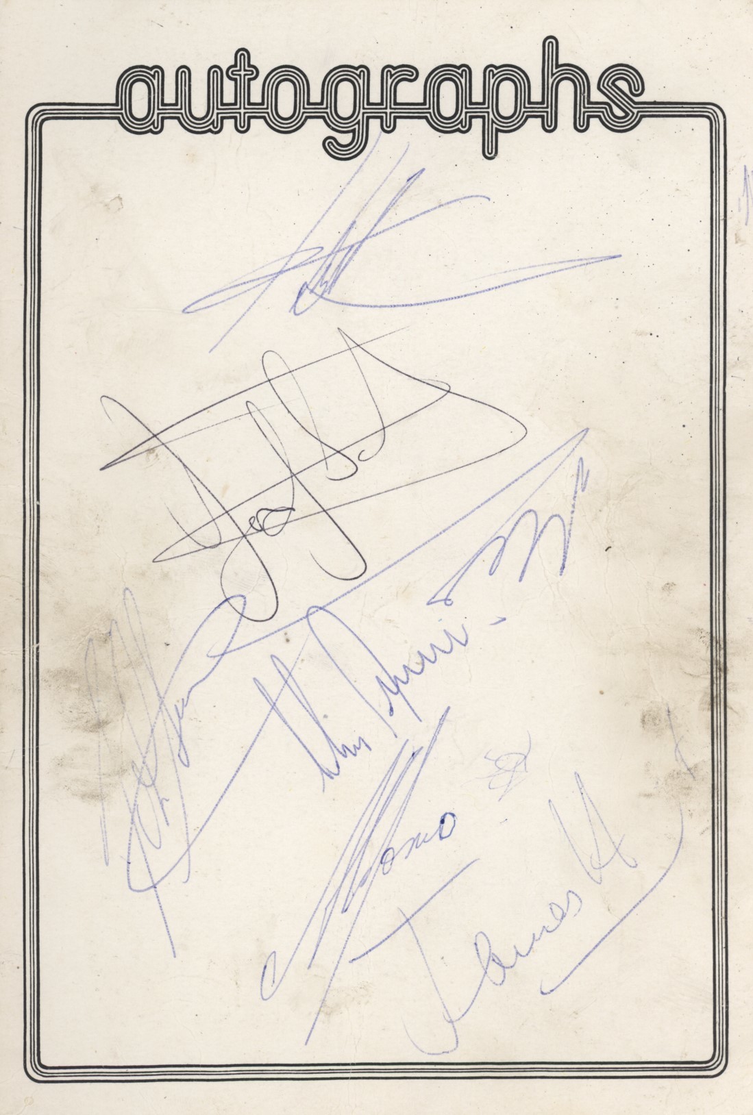 The official programme is lightly rubbed but generally good. The racecard has some results recorded and is signed to the back page by 6 or 7 drivers, including James Hunt and Jody Scheckter. This page has a few grubby marks.