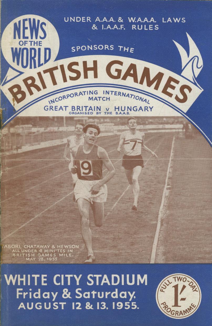 Official programme for the athletics match held at White City on August 12-13, 1955.