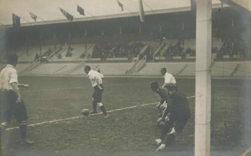 Original photographic postcard, showing a moment during the semi-final of the Stockholm Olympic football tournament. Great Britain won the match 4-0 and went on to win the tournament. Postally unused. Very good condition.