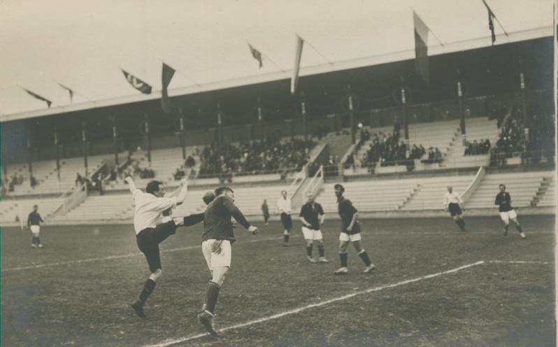 Original photographic postcard, showing a moment during the semi-final of the Stockholm Olympic football tournament. Great Britain won the match 4-0 and went on to win the tournament. Postally unused. Very good condition.