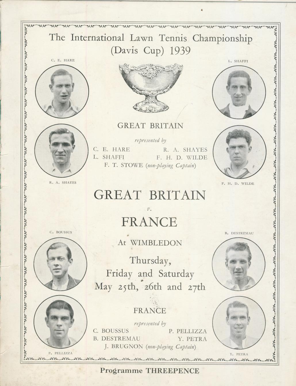 Official programme for the Europe-Zone quarter-final of the Davis Cup, held at Wimbledon on May 25-27, 1939. GB won 3-2 but lost in the next round to Germany.