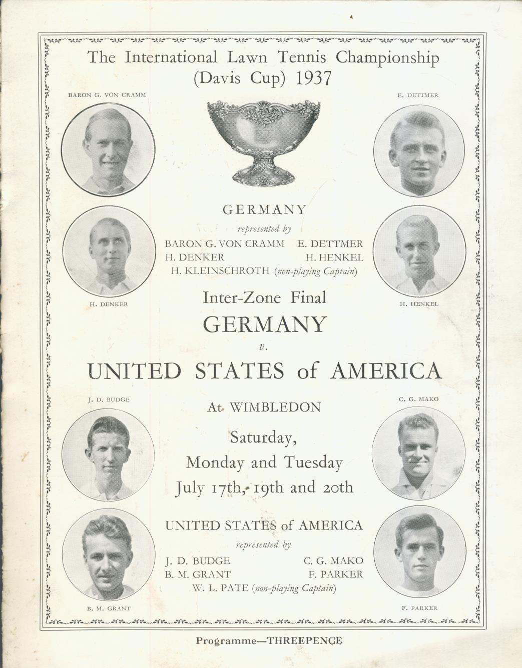 Official programme for the Inter-Zone final of the Davis Cup, held at Wimbledon on July 17-20, 1937. USA won 3-2 and went on to win the tournament.