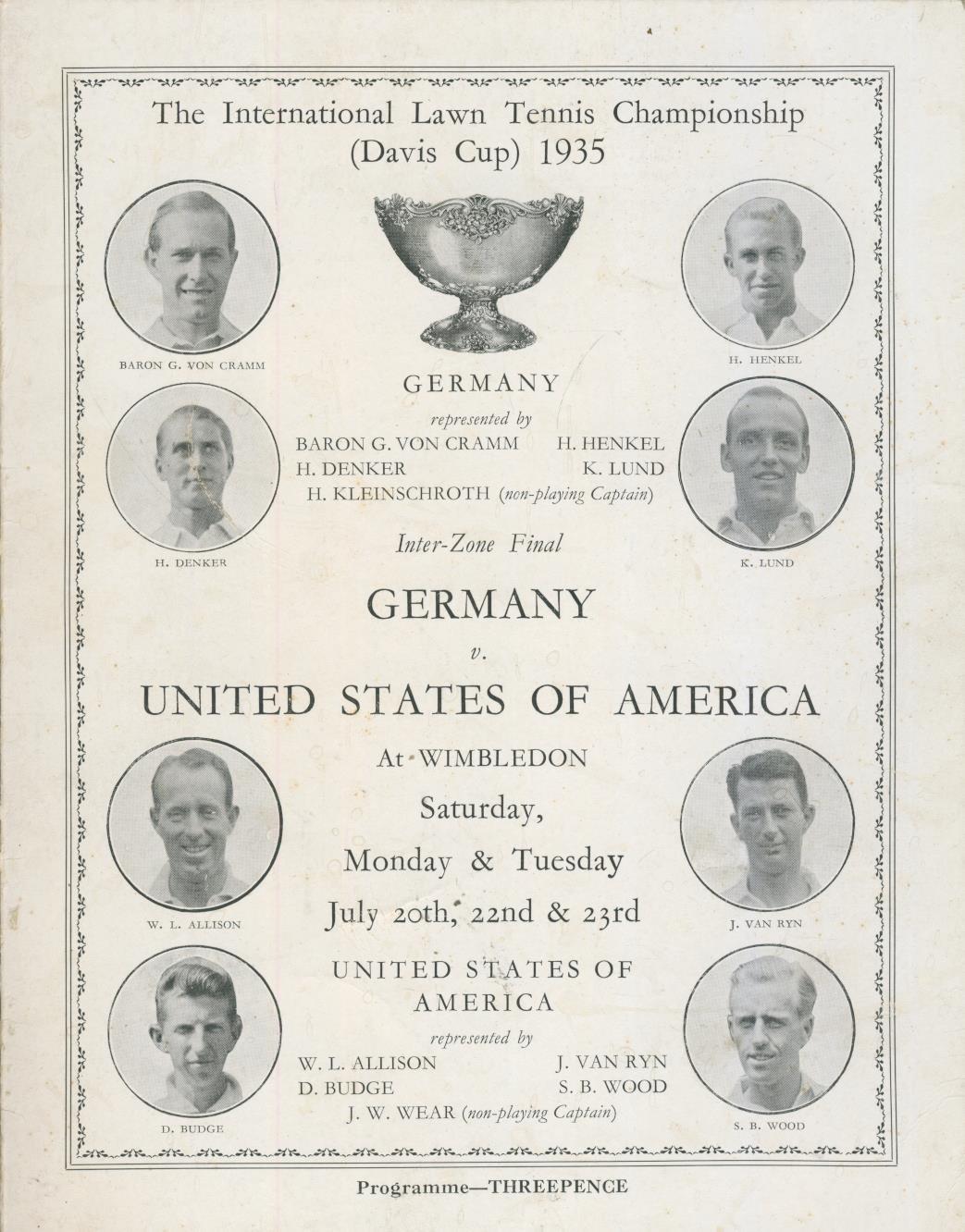 Official programme for the Inter-Zone final of the Davis Cup, held at Wimbledon on July 20-23, 1935. USA won 4-1 before going on to lose to Great Britain in the final.