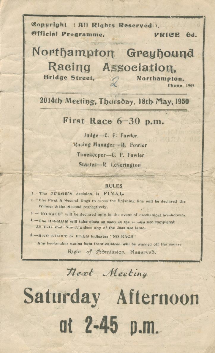 Other Sports » General Sport » Memorabilia » GREYHOUND RACING CARD - NORTHAMPTON GREYHOUND RACING ASSOCIATION, 18 MAY 1950
