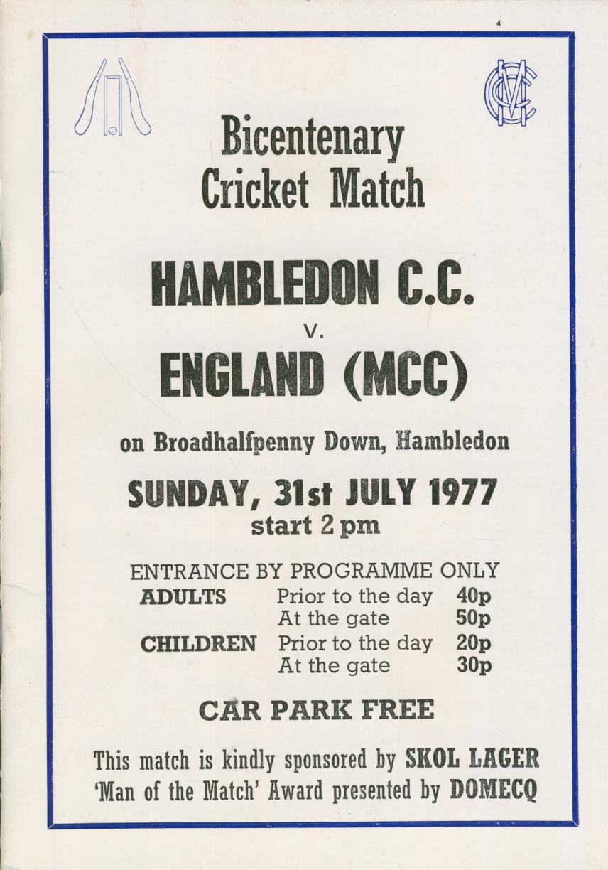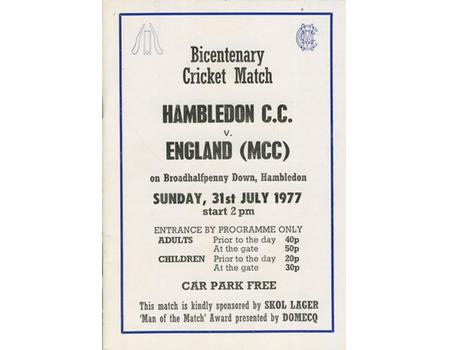 Cricket » Cricket Programmes » Other Cricket Matches » HAMBLEDON C.C. V ENGLAND (MCC) 1977 CRICKET PROGRAMME