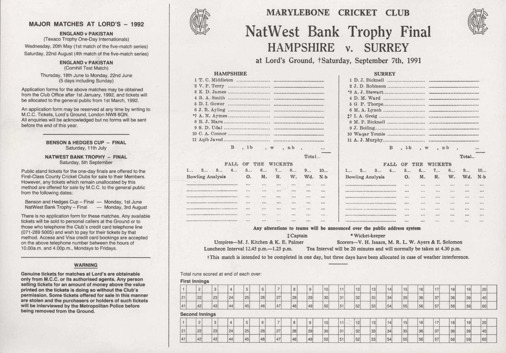 HAMPSHIRE v SURREY 1991 NATWEST FINAL CRICKET SCORECARD